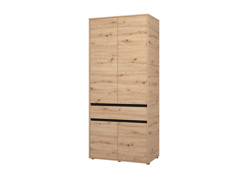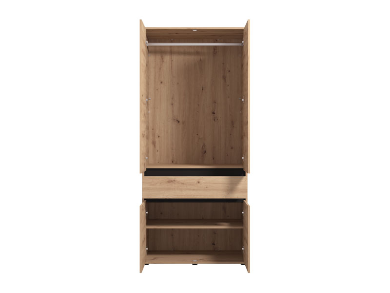 Ormar CORBETT 2K1F h211 u kombinaciji dekora artisan hrasta i crne mat folije, sa garderobnom šipkom u gornjem delu, jednom praktičnom fiokom u središnjem delu i zatvorenim pregradnim segmentom u donjem delu, funkcionalno i estetski će doprineti organizaciji ambijenta.
