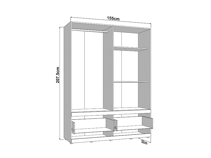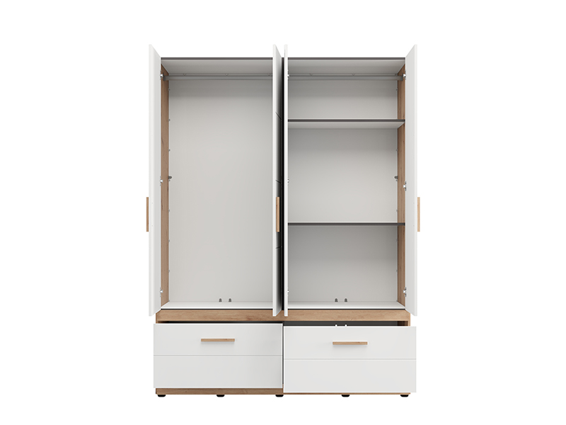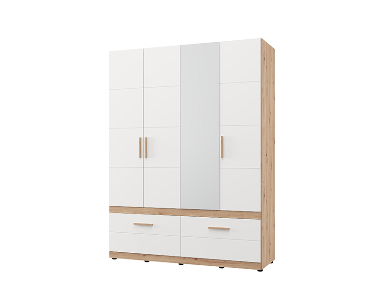 Ormar DILLON 4K2F1O h207, u kombinaciji artisan hrast i opak belog dekora, predstavlja funkcionalno i elegantno rešenje za organizaciju garderobe. Upotrebni prostor se sastoji od dva dvokrilna dela - jedan deo sa garderobnom šipkom, a drugi deo sa pregradama. Ispod zatvorenih delova nalaze se dve duboke i prostrane fioke, omogućavajući preglednu i praktičnu organizaciju odeće i dodataka. Na jednom frontu se nalazi ogledalo, koje doprinosi praktičnosti i estetskom utisku prostora. Upotrebni prostor se može dodatno proširiti dodavanjem seta polica za još veću funkcionalnost.