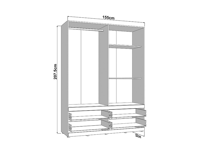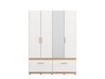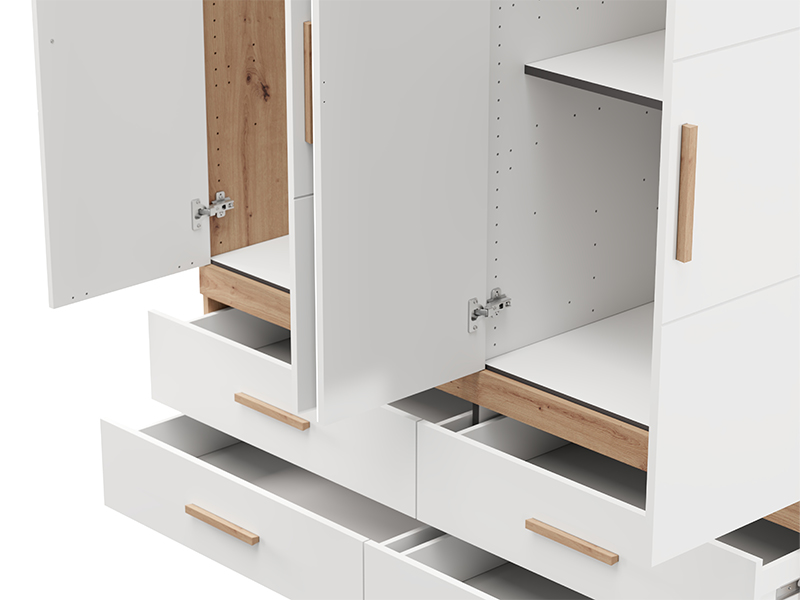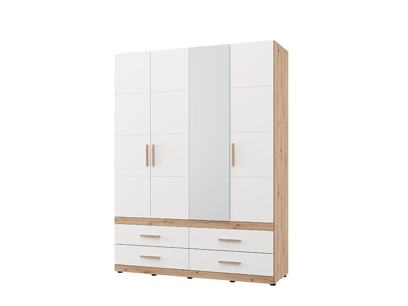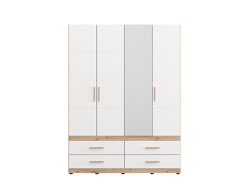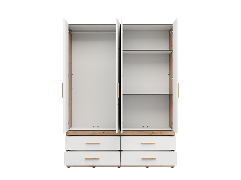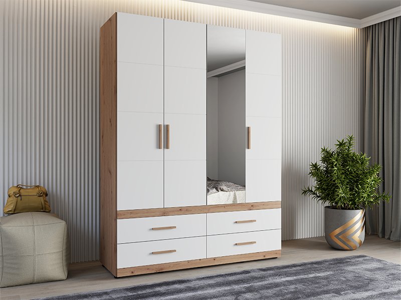 Ormar DILLON 4K4F1O h207, u kombinaciji artisan hrast i opak belog dekora, predstavlja funkcionalno i elegantno rešenje za organizaciju garderobe. Upotrebni prostor se sastoji od dva dvokrilna dela - jedan deo sa garderobnom šipkom, a drugi deo sa pregradama. Ispod zatvorenih delova nalaze se četiri prostrane fioke, po dve ispod svakog dvokrilnog dela, omogućavajući preglednu i praktičnu organizaciju odeće i dodataka. Na jednom frontu se nalazi ogledalo, koje doprinosi praktičnosti i estetskom utisku prostora. Upotrebni prostor se može dodatno proširiti dodavanjem seta polica za još veću funkcionalnost.