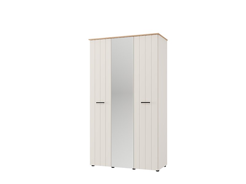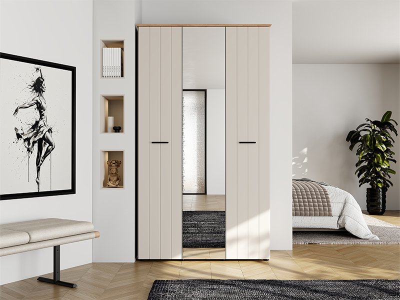 Ormar LAMBETH 3K1O h217, izrađen u kombinaciji kašmira i artisan hrast dekora, doprinosi toplom i rustičnom izgledu spavaće sobe, naglašavajući jasno definisanu geometrijsku liniju dizajna i utisnute pruge na frontovima.