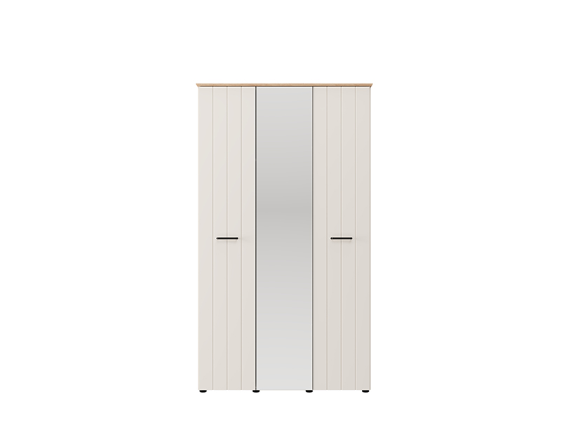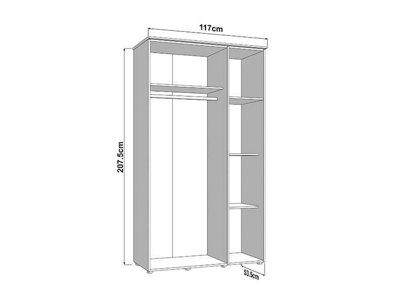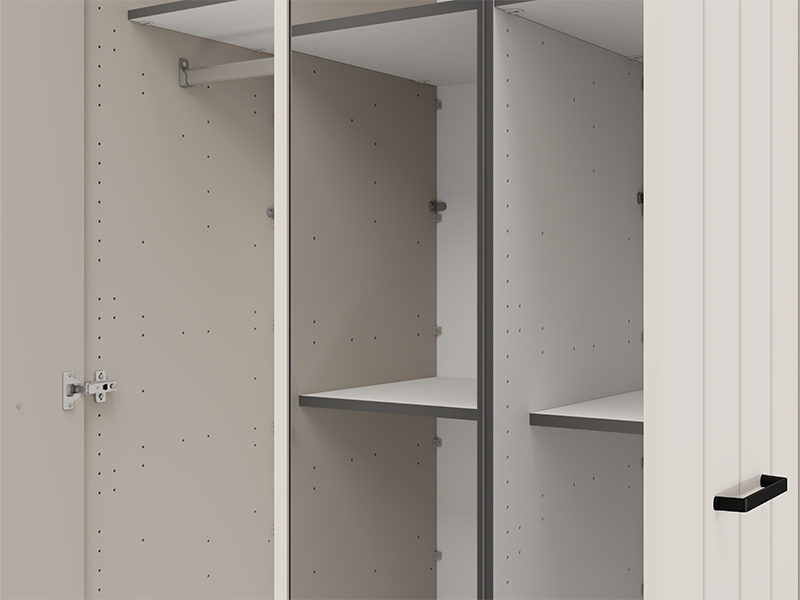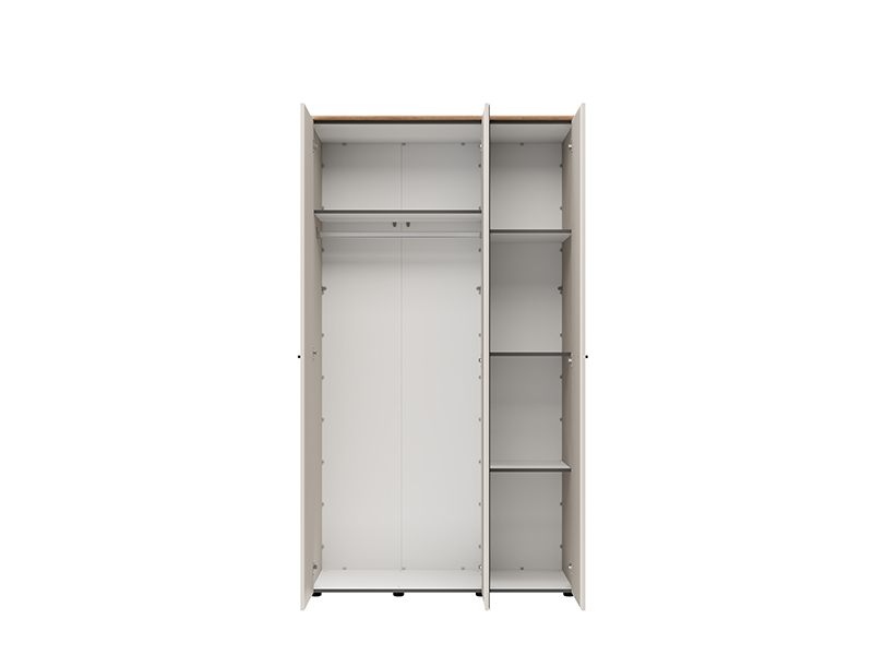 Trokrilni ormar organizovan je tako da dvokrilni deo sadrži garderobnu šipku, dok jednokrilni pregradni deo pruža dodatni prostor za pregledno i praktično odlaganje odeće. Ormar takođe nudi mogućnost naknadnog dodavanja seta polica, čime se funkcionalnost unutrašnjeg prostora dodatno povećava.