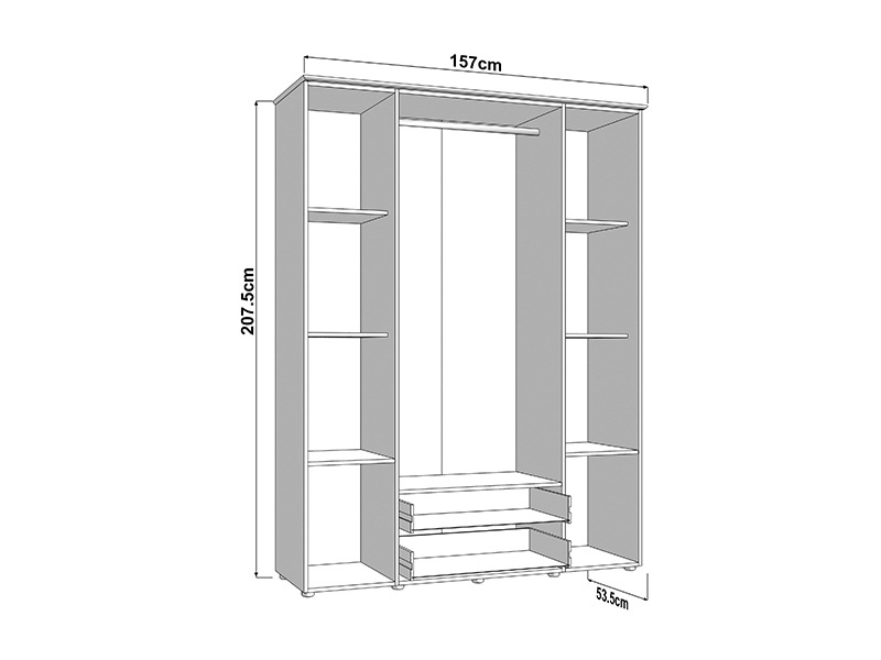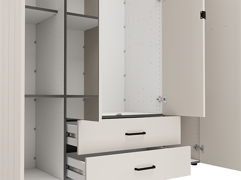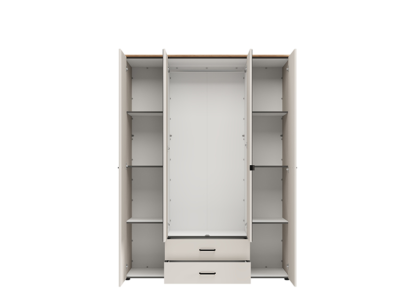 Četvorokrilni ormar LAMBETH 4K2F2O h207 organizovan je tako da centralni frontovi poseduju ogledala, a upotrebni prostor u tom delu sadrži garderobnu šipku i dve fioke ispod, što omogućava pregledno i praktično odlaganje odeće i manjih predmeta. Levi i desni pregradni deo ormara pružaju dodatni prostor za organizaciju garderobe i drugih predmeta. Ormar takođe nudi mogućnost naknadnog dodavanja seta polica, čime se dodatno unapređuje funkcionalnost unutrašnjeg prostora.