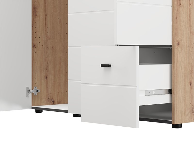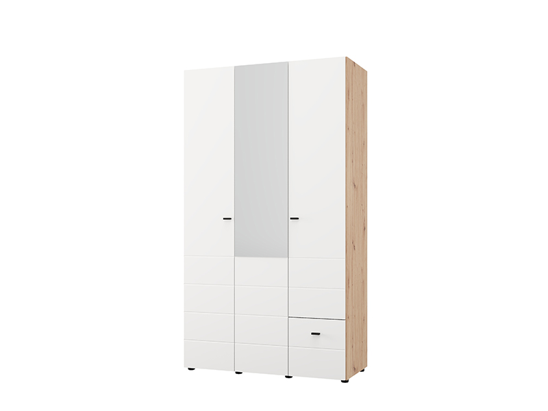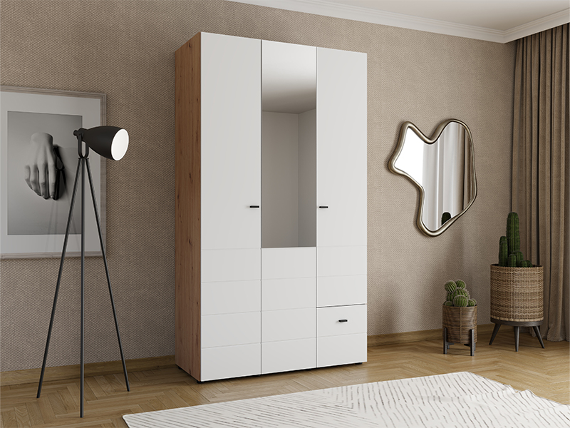 Ormar NEVIS 3K1F1O h207, u kombinaciji artisan hrast i opak belog dekora, predstavlja funkcionalno i moderno rešenje za odlaganje garderobe. Upotrebni prostor obuhvata dvokrilni deo sa garderobnom šipkom, jedan pregradni segment i jednu duboku fioku, omogućavajući praktičnu i preglednu organizaciju odeće i dodataka. Postoji mogućnost dodavanja seta polica za još bolju organizaciju unutrašnjeg prostora. Ogledalo dodatno doprinosi funkcionalnosti i vizuelno oplemenjuje prostor. Ormar NEVIS 3K1F1O h207 pripada kolekciji NEVIS i može se kombinovati sa ostalim modelima iz iste linije.