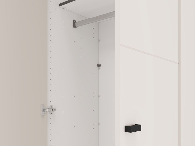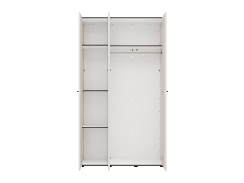 Upotrebni prostor trokrilnog ormara organizovan je kroz dvokrilni deo sa garderobnom šipkom za odlaganje odeće i jednokrilni deo sa policama, koji omogućava pregledno skladištenje garderobe i dodataka.