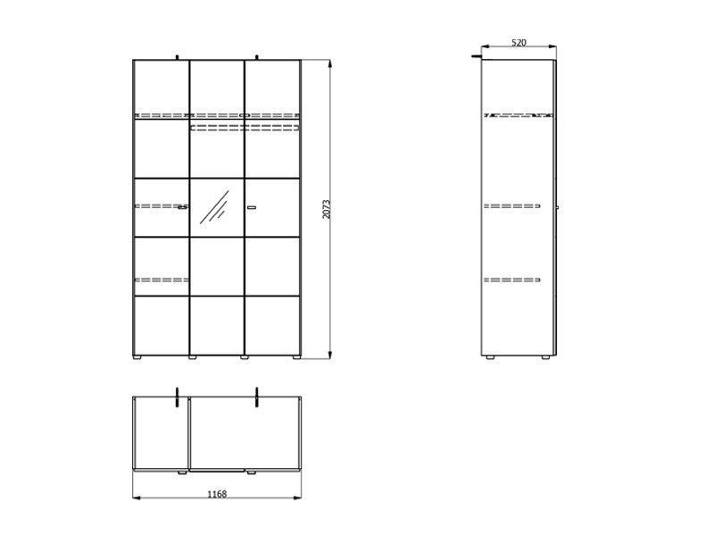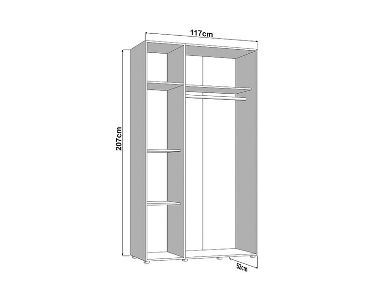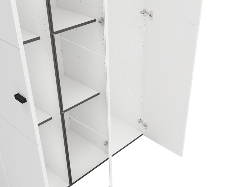 Upotrebni prostor trokrilnog ormara organizovan je kroz dvokrilni deo sa garderobnom šipkom za odlaganje odeće i jednokrilni deo sa policama, koji omogućava pregledno skladištenje garderobe i dodataka.