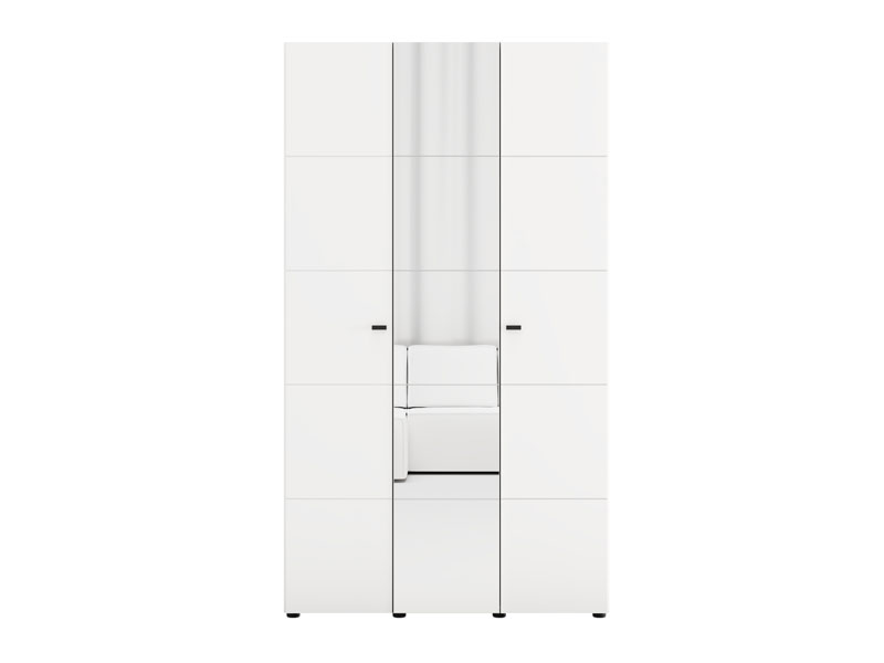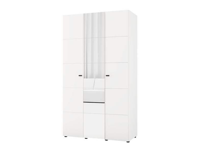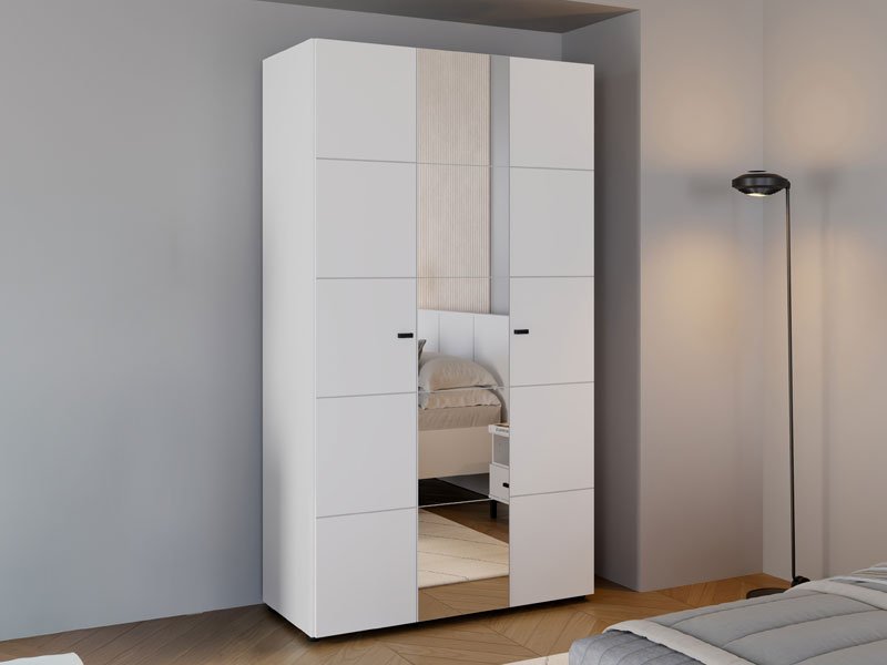 Ormar SALAMIS 3K1O h207, izrađen u elegantnom opak bela dekoru, doprinosi smirenom i modernom izgledu spavaće sobe, dok ogledalo na srednjem frontu dodatno unapređuje funkcionalnost i vizuelni doživljaj prostora.