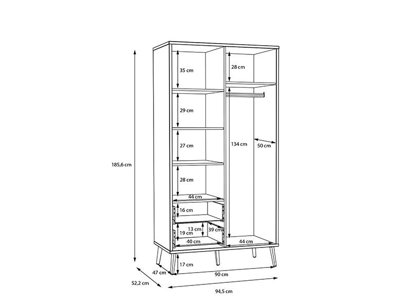 Tačan naziv dezena: korpus iverica Mauvella hrast D108, front iverica Sage U59 / Mauvella hrast D108 . Model ormara WHENUA 90 sa garderobnom šipkom, policama i dve fioke, namenjen je za odlaganje odeće i posteljine.