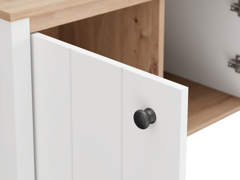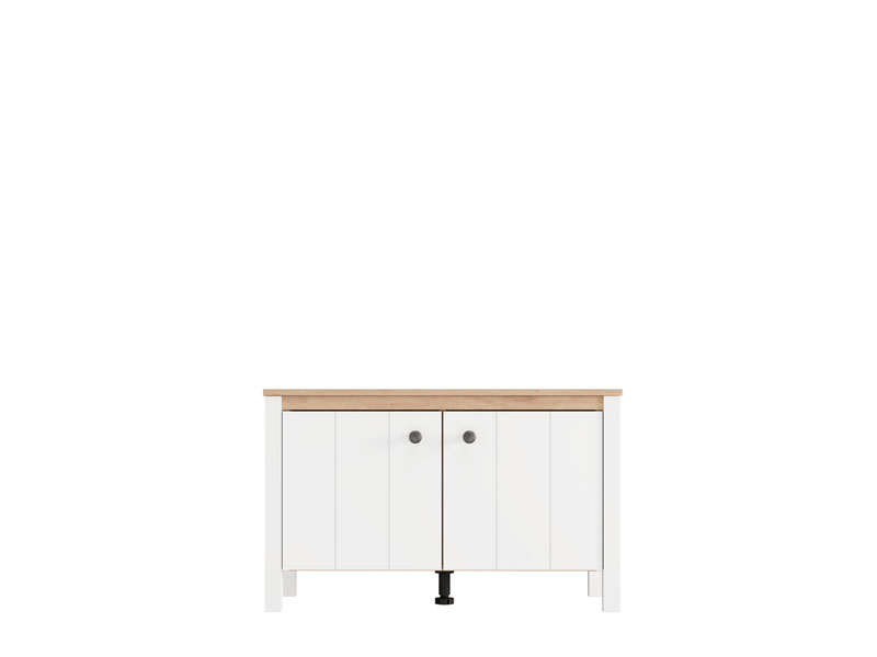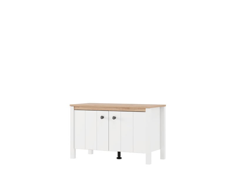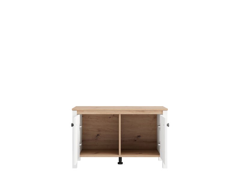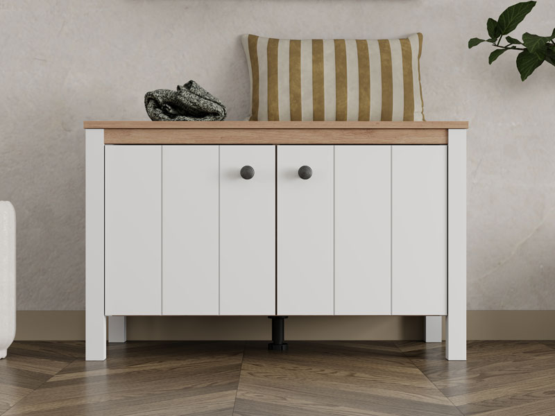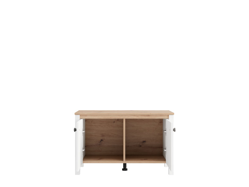 Element predsoblja BEDFORD KOM 2K2V, u kombinaciji opak belog dekora, artisan hrasta, bele mat folije i artisan hrast folije, poseduje praktičan dvodelni zatvoren deo za odlaganje obuće, dok gornji deo može poslužiti kao površina za sedenje ili odlaganje manjih predmeta. Ovaj element se može kombinovati sa drugim elementima kolekcije BEDFORD, čime se stvara skladna i funkcionalna enterijerska celina ulaznog prostora.