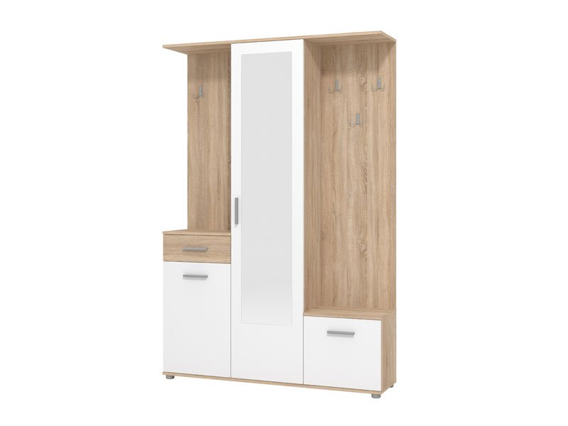 Predsoblje MARTIN, u sonoma hrast i opak belom dezenu, učiniće da prvi suret sa vašim domom bude efektan i prijatan. Ovaj model poseduje skladno organizovan upotrebni prostor za odlaganje sezonske garderobe i obuće tako da ćete postići funkcionalno organizovan prostor, dok centralno pozicionirano ogledalo donosi osećaj prostranosti.