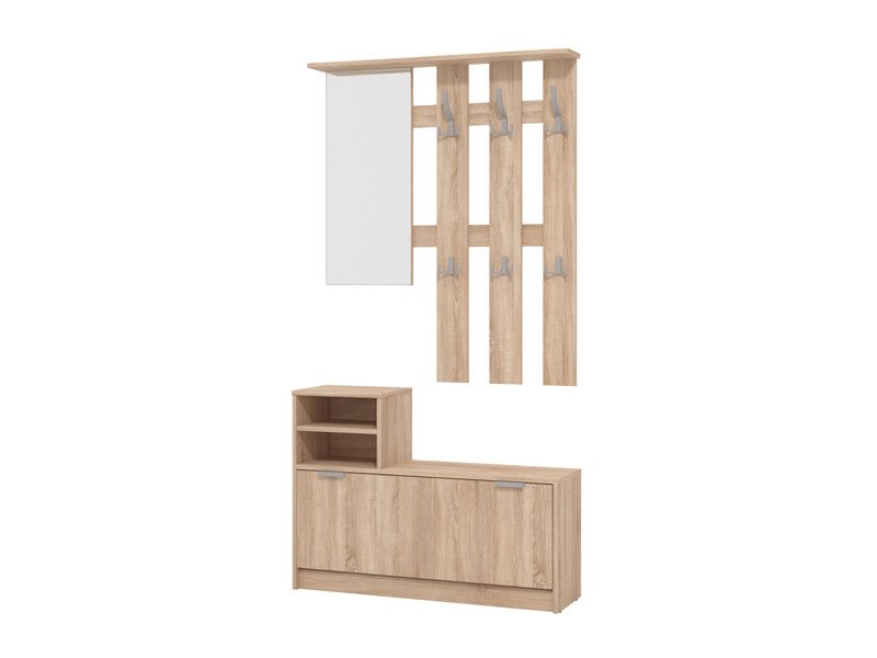 Predsoblje RAVENNA, u sonoma hrast dezenu, sastoji se iz dva praktična dela koja će vam pomoći da svoju omiljenu obuću i odeću adekvatno odložite. Gornji deo koji se kači na zid sadrži zakačke i ogledalo, dok je donji sa dve otvore police i zatvorenim segmentom za odlaganje obuće.