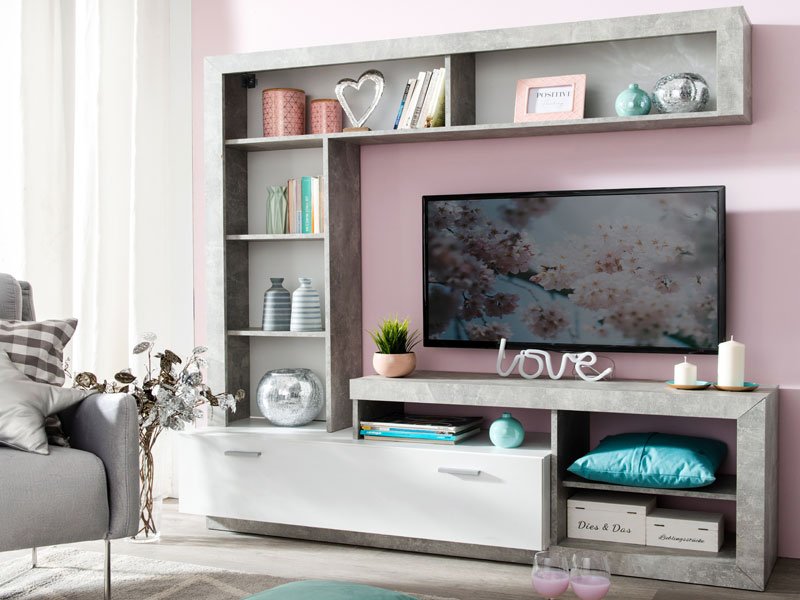 Regal GLEN, u kombinaciji opak bela i beton dezenu, prati usaglašenost forme i funkcije, kao i upečatljiv dizajn namenjen modernom osveženju dnevnog boravka. Zatvoreni deo, centralno pozicionirana TV polica i otvoreni segmenti formiraju kompaktnu celinu za čuvanje svih vaših dragih sitnica i audio-vizuelnih uređaja. Prostor za TV je 115,4x82,5cm (do 55").