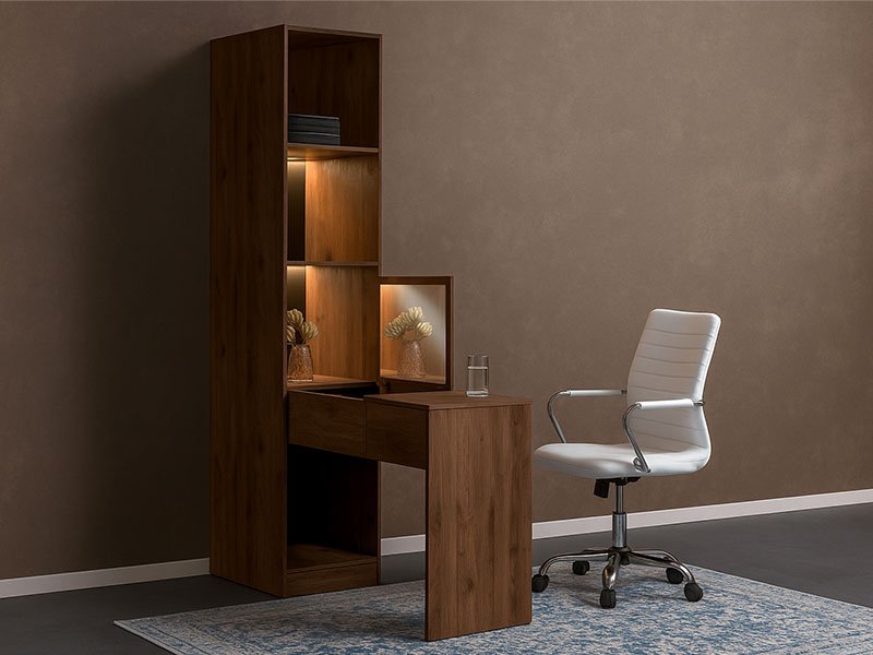Tačan opis dezena je: korpus / front iverica tamni orah. Toaletni sto WENECJA je odličan izbor za dopunu ambijenta spavaće koja bi zadovoljila i sve praktične i estetske potrebe. Upotrebni prostor čine police, radna površina, skrivena polica za odlaganje ispod radne površine, kao i fioka za odlaganje šminke ili nakita. Zahvaljujući ogledalu koje se nalazi na frontu koji zatvara skrivenu pregradu ispod radne poršine, ovaj sto omogućava kompletnu opremljenost kutka za negu. Toaletni sto WENECJA ima mogućnost dodavanja led rasvete predviđene za dve pozicije.