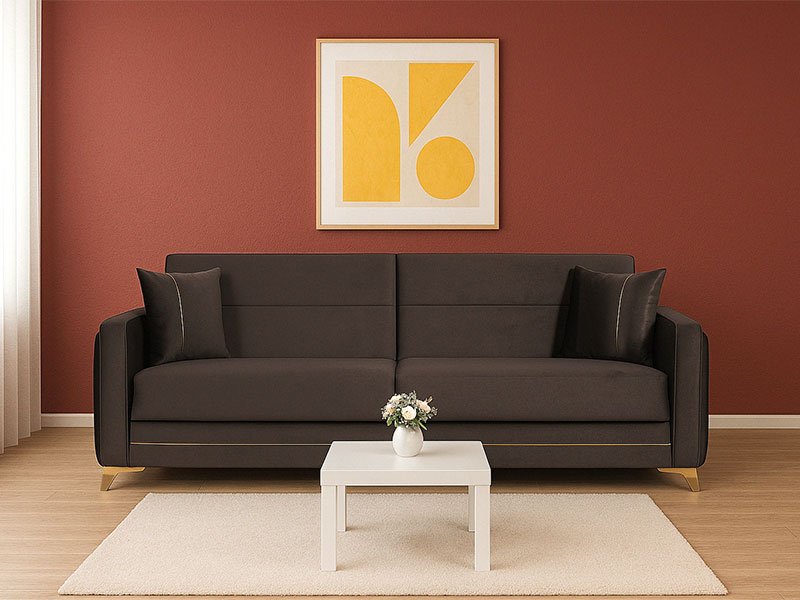 Tačan naziv dezena : sedište / naslon / rukonaslon štof 27-911 braon mali jastuk j štof 27-911 braon, aplikacija zlatna.Trosed CAVANA je odličan izbor za uređenje ambijenta dnevnog boravka, a pored svedenog dizajna karakteriše ga i izuzetna funkcionalnost. Sedalni deo i naslon izrađeni su od žičanog jezgra i sunđera, a poseduje mogućnost rasklapanja klik-klak mehanizmom u površinu za spavanje dimenzija 112x189 cm. U kombinaciji sa istoimenim trosedom i foteljom čini kompaktnu celinu za komforno uređenu dnevnu sobu.