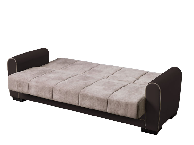 Tačan naziv dezena: sedište / naslon štof 10-003 braon, rukon eko koža braon, mali jastuk štof 10-003 braon. Trosed VIOLA idealan je pratilac savremenog tempa života zahvaljujući dizajnu. Uz ovaj model ležaja jednostavno ćete dnevni prostor transformisati u zonu za odmor uz mogućnost pretvaranja u ležaj klik-klak mehanizmom sa površinom za spavanje 115x180cm. Poseduje žičano jezgro i funkcionalan prostor za odlaganje posteljine.