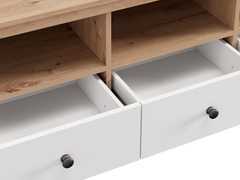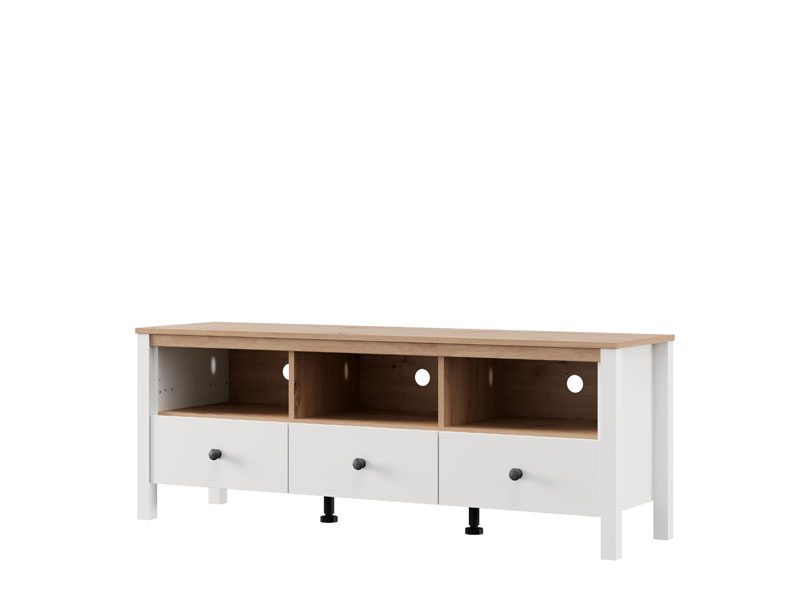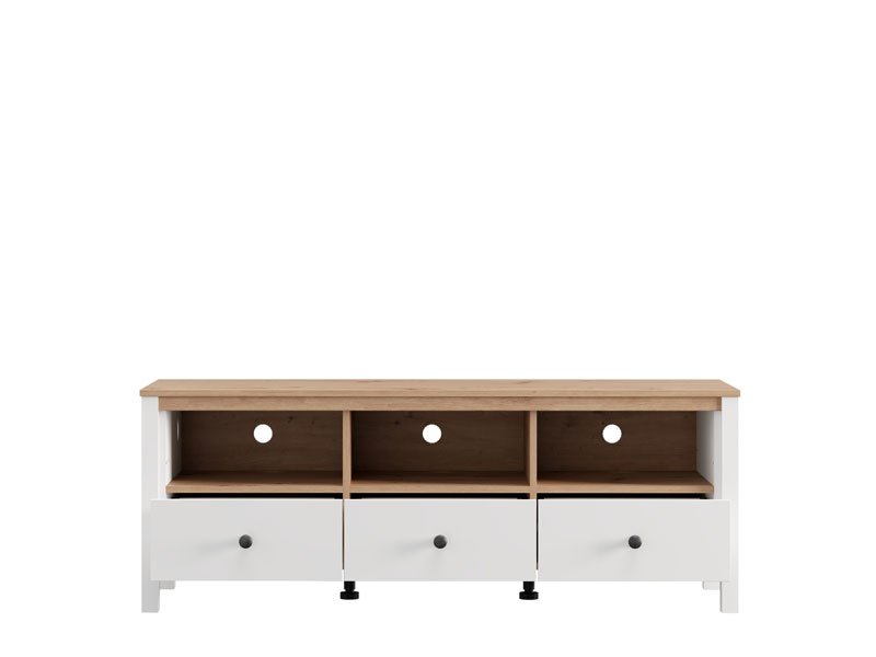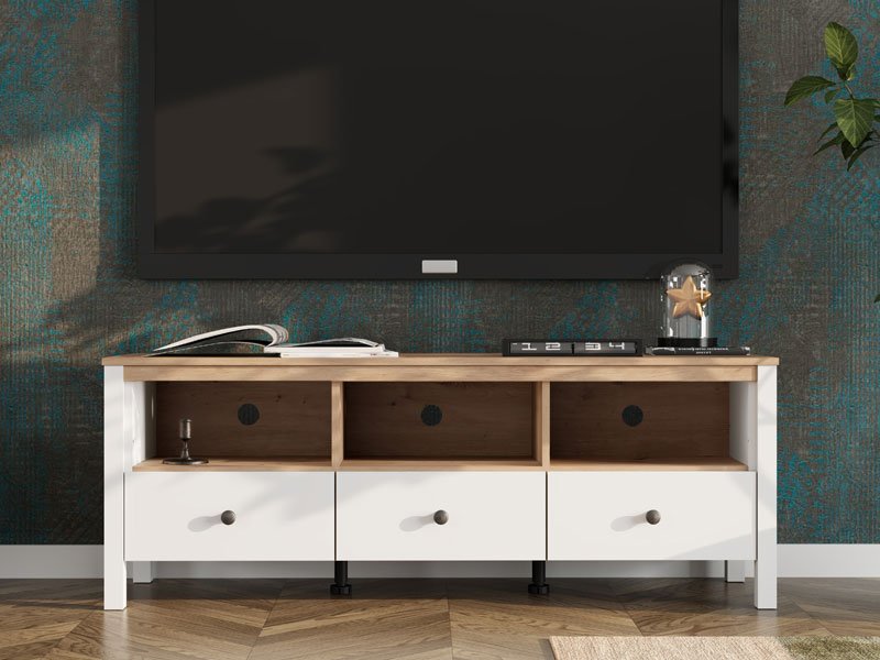 TV polica BEDFORD TV 143 3K3F u kombinaciji opak belog dekora, artisan hrasta, bele mat folije i artisan hrast folije unosi u prostor toplinu, eleganciju i prirodan šarm. Upotrebni prostor čine tri otvorene pregrade i tri fioke, koje omogućavaju praktično i organizovano odlaganje medijskih uređaja, knjiga i dekorativnih predmeta. TV polica BEDFORD TV 143 3K3F je deo sistema elemenata BEDFORD, koji odlikuje spoj rustične estetike i funkcionalnog, modernog dizajna.