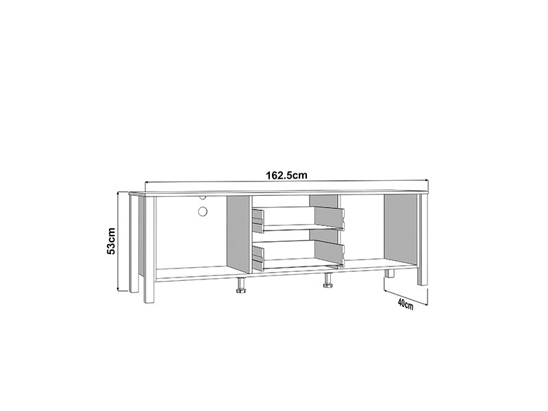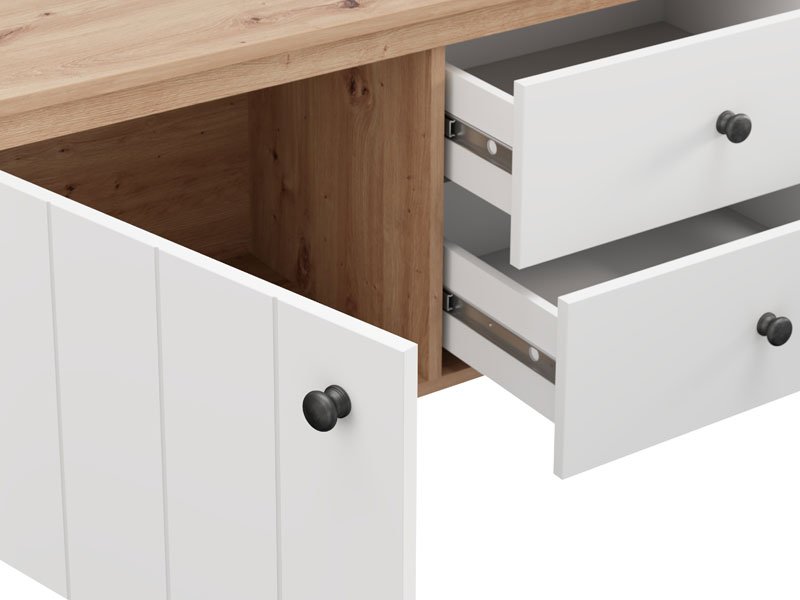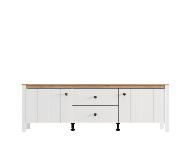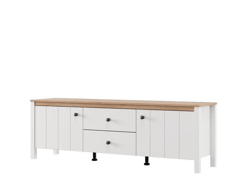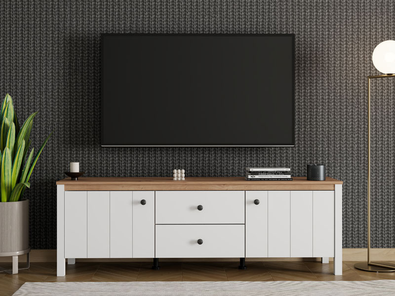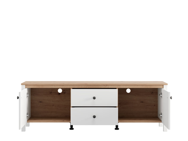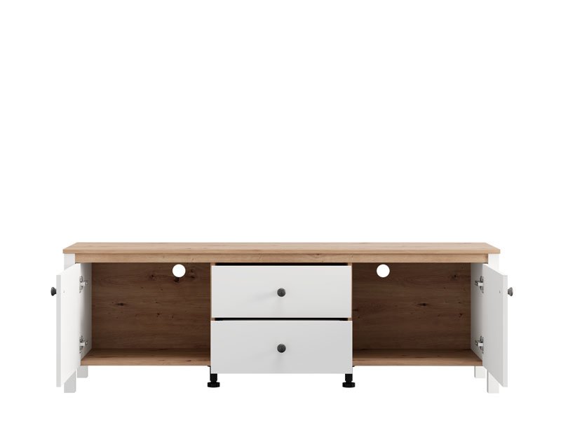 TV polica BEDFORD TV 162 3K2F2V u kombinaciji opak belog dekora, artisan hrasta, bele mat folije i artisan hrast folije unosi u prostor toplinu, eleganciju i prirodan šarm. Upotrebni prostor čine dva zatvorena pregradna dela i dve fioke, koje omogućavaju praktično i organizovano odlaganje medijskih uređaja, knjiga i dekorativnih predmeta. TV polica BEDFORD TV 162 3K2F2V je deo sistema elemenata BEDFORD, koji odlikuje spoj rustične estetike i funkcionalnog, modernog dizajna.