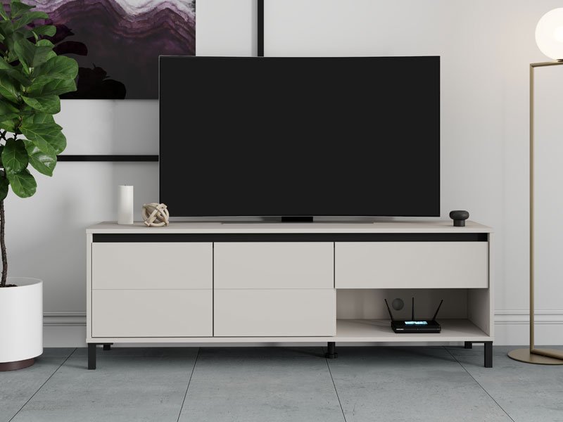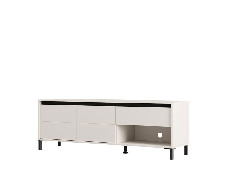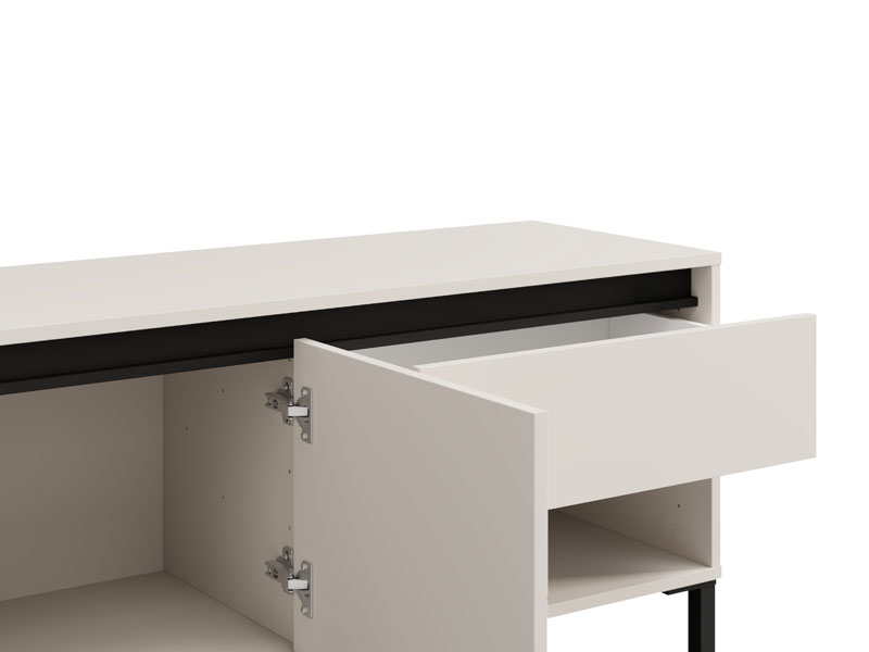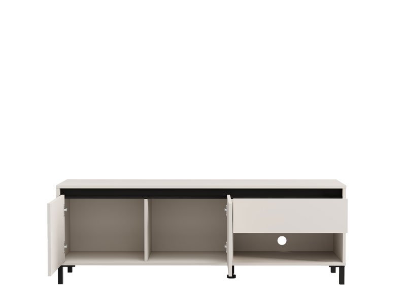 TV polica MARRON TV 150 3K1F2V u kombinaciji dekora kašmira i crne mat folije unosi u prostor moderan vizuelni kontrast i sofisticiranu toplinu. Upotrebni prostor čine dva zatvorena pregradna dela, jedna otvorena polica i jedna fioka, koje omogućavaju praktično i organizovano odlaganje. TV polica MARRON TV 150 3K1F2V je deo sistema elemenata MARRON, koji odlikuje sklad modernih tonova i funkcionalnost savremenog dizajna.