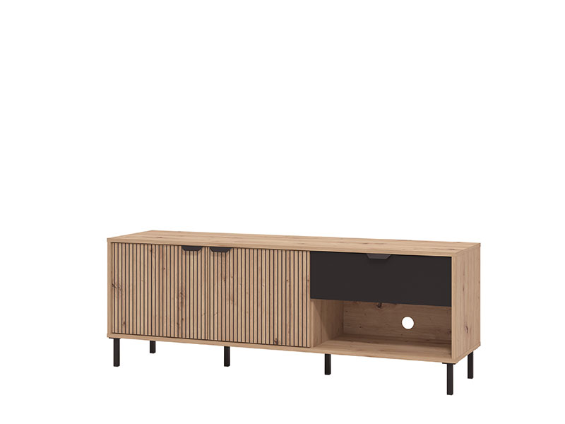 TV polica MAYENNE TV 150 3K1F2V, u kombinaciji dekora artisan hrasta i crne mat folije, deo je istoimene kolekcije koja će doprineti da vaš dom bude opremljen po najnovijim enterijerskim standardima. TV polica MAYENNE TV 208 4K2F3V poseduje zatvoren i otvoren segment, kao i jednu fioku.