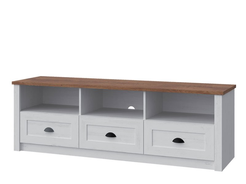 Tačan naziv dezena je: korpus iverica Sosna andersen, front iverica Lefkas ciemny. TV polica PROWANSJA RTV deo je istoimene kolekcije za opremanje dnevnog boravka koju odlikuje šarmantan i topao retro stil koji nikada neće izaći iz mode.