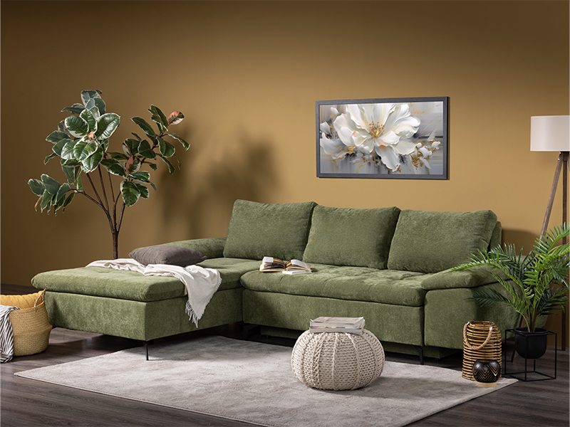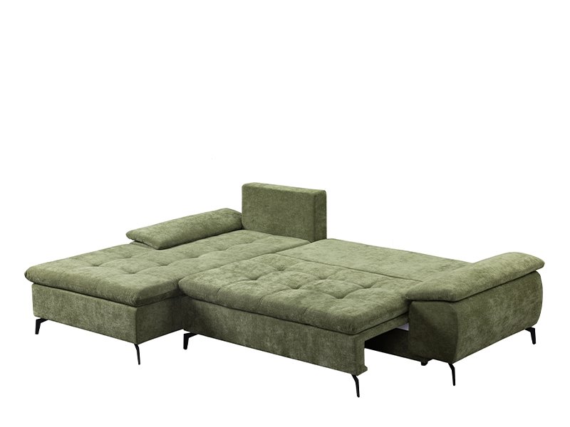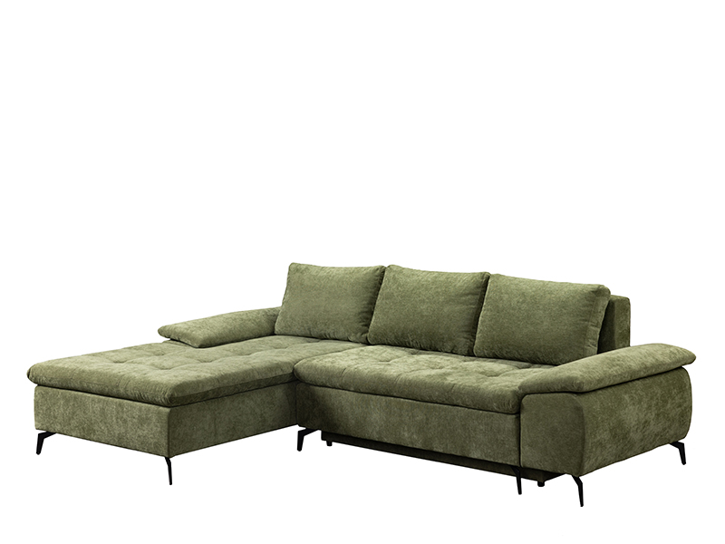 Tačan naziv dezena je: Štof WIND 34 zelena, ugao levo. Ugaona garnitura ANDI odlikuje se modernim dizajnom i prostranošću, idealnom za savremeno uređen dnevni prostor. Praktičnim sistemom obaranja naslona lako se transformiše u ležaj sa površinom za spavanje dimenzija 134x200 cm. Izrađena je od sunđera, pružajući dobar nivo komfora u svakodnevnoj upotrebi. Garnitura poseduje kutiju za odlaganje, praktičnu za čuvanje posteljine i drugih stvari.