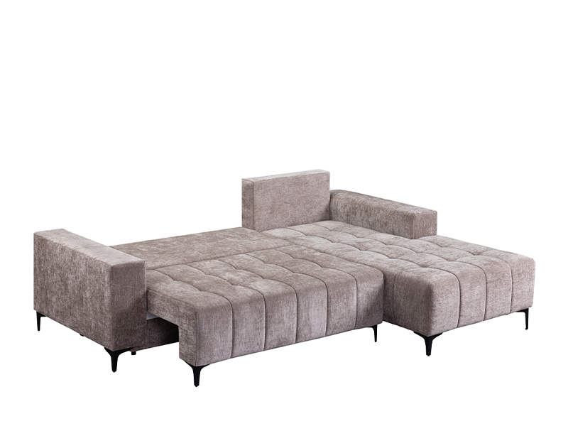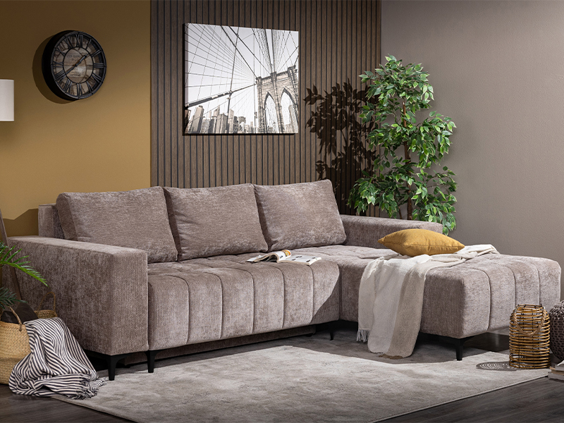 Tačan naziv dezena je: Štof VIBE 21 braon, ugao desno. Ugaona garnitura BOGOTA odlikuje se modernim i elegantnim dizajnom, idealnim za savremeno uređen dnevni prostor. Praktičnim sistemom obaranja naslona lako se transformiše u ležaj sa površinom za spavanje dimenzija 134x200 cm. Izrađena je od sunđera, pružajući dobar nivo komfora u svakodnevnoj upotrebi. Garnitura poseduje jednu kutiju za odlaganje, pogodnu za čuvanje posteljine ili drugih potrebnih stvari.