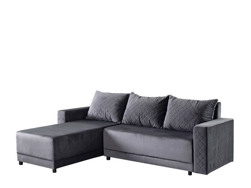 Tačan naziv dezena: sedište štof riviera 95 tamno siva, naslon/rukonaslon/veliki jastuk štof riviera 95 karo tamno siva. Ugaona garnitura LOTOS poseduje mogućnost pretvaranja u ležaj dimenzija 115x200 cm obaranjem naslona i, zahvaljujući svojim dimenzijama, predstavlja izuzetno praktično rešenje za opremanje životnog prostora. Prijatna dizajnerska nota koja se ogleda kroz savremeni svedeni stil, doprinosi fleksibilnom kombinovanju sa raznovrsnim komadima nameštaja. Model ugaone garniture LOTOS poseduje kutiju za odlaganje posteljine i univerzalan ugao. Štof je pet friendly.