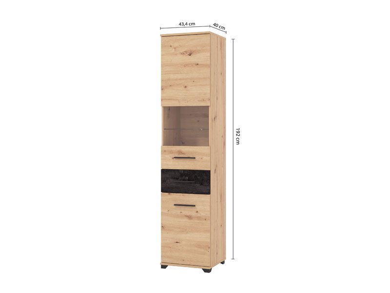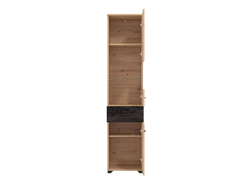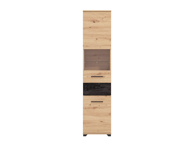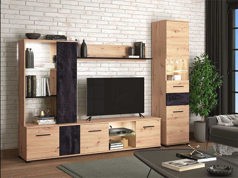 Vitrina ALHAMBRA, izrađena u kombinaciji artisan hrasta i carbon dezena, predstavlja kompaktan model vitrine namenjen modernim ambijentima. Sastoji se od kombinacije otvorenih i zatvorenih polica i pogodan je kako za audio-vizuelne uređaje, tako i za dekor i odlaganje potrebnih stvari. Postoji mogućnost dodatne rasvete, koja može doprineti isticanju estetike celog ambijenta.
