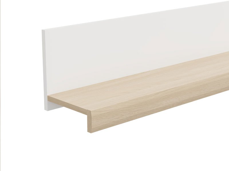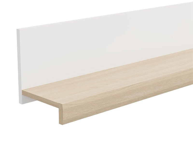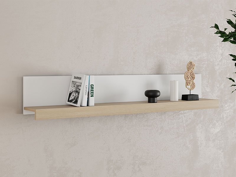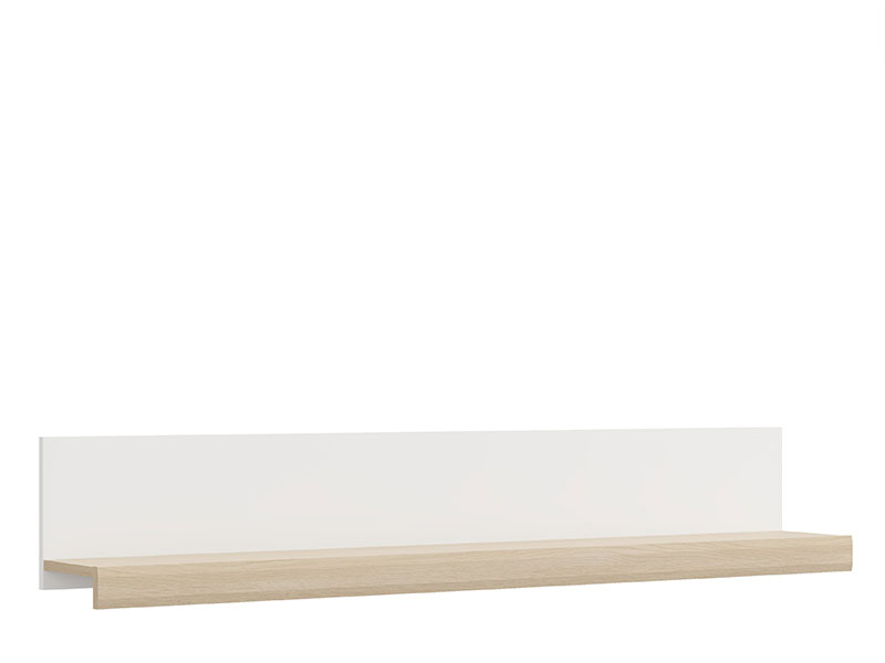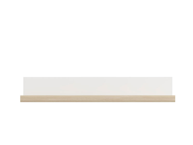 Zidna polica CARLOW ZP predstavlja jednostavan i funkcionalan element za opremanje dnevnog boravka. Izrađena je u kombinaciji opak belog dekora, svetlog lučkog hrasta i folije svetlog lučkog hrasta, što doprinosi modernom i svetlom izgledu prostora. Pogodna je za izlaganje dekorativnih predmeta ili knjiga i skladno se uklapa sa ostalim elementima sistema CARLOW.