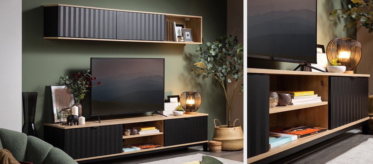 Regal je dizajniran tako da balansira funkcionalnost i estetiku - praktičnost je spojena sa modernim izgledom, pružajući dovoljno prostora za TV, knjige i dekorativne predmete. Neutralna paleta nameštaja predstavlja savršenu osnovu za akcentne boje: kombinacija sa belom, sivom ili krem stvara prozračan i smiren ambijent, dok crni detalji daju definiciju i strukturu prostoru. Za dramatičniji i luksuzniji efekat, zid u tamnozelenoj nijansi u kombinaciji sa metalnim akcentima u zlatu ili mesingu na dekoraciji i rasveti stvara sofisticirani kontrast. Topli akcenti u žutoj ili narandžastoj boji lepo se uklapaju sa neutralnim drvetom i crnim elementima.