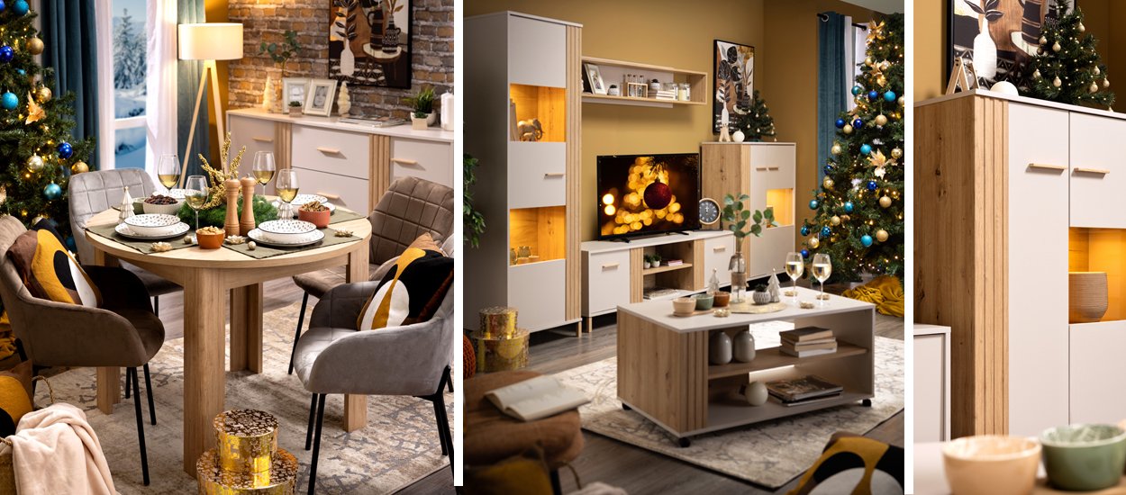 Dnevni boravak tokom novogodišnjih praznika postaje srce doma, mesto okupljanja i praznične topline. Klub sto BELFORT, koji je deo BELFORT sistema elemenata, osvaja pažnju raskošnim spojem dekora artisan hrasta, nežnog dekora kašmira, kao i artisan hrast folije, stvarajući u prostoru osećaj sofisticirane elegancije i prijatne, ambijentalne topline. Njegov prefinjen dizajn i uravnotežen stilski izraz savršeno odgovaraju potrebama savremenih enterijera koji teže harmoniji i estetici.