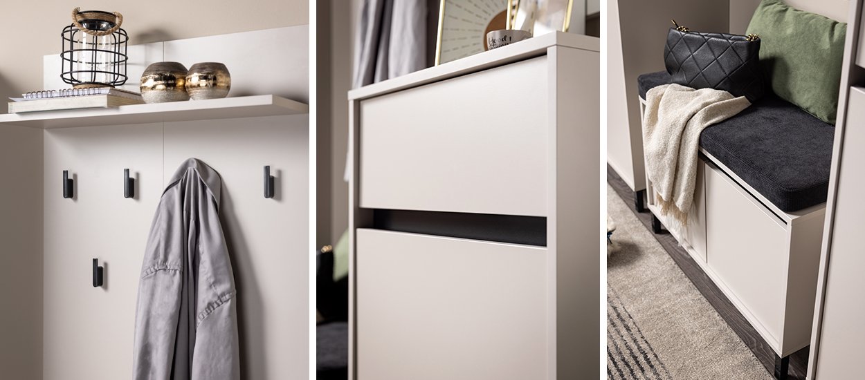 Element predsoblja ARRAN CIV, takođe u sofisticiranom kašmir dekoru, unosi osećaj lakoće, svežine i prefinjene elegancije u predsoblje. Zahvaljujući funkcionalnim kačilicama za odlaganje garderobe, pruža praktičnost u svakodnevnoj upotrebi, dok se svojim dizajnom savršeno uklapa sa ostalim elementima kolekcije, doprinoseći uređenom i estetski usklađenom izgledu ulaza u dom.
