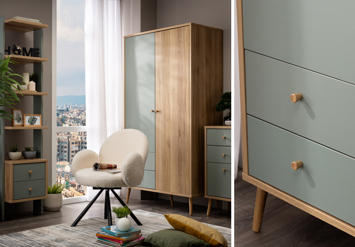 Sastavni deo jedne funkcionalne spavaće sobe, posebno ako govorimo o sobi za mlade, pored osnovnih elemenata nameštaja, svakako je i radni kutak. Njegov glavni element je radni sto, a model koji se odlačno uklapa u svaki ambijent, a ne zauzima puno prostora, jeste radni sto WHENUA, izrađen u kombinaciji dekora hrasta i frontova u nežno pastelnoj zelenoj nijansi. Ima savršene detalje poput ručica i podignutih nogara u istom dekoru, a sadrži izdvojen deo sa fiokom i zatvorenim pregradnim delom.