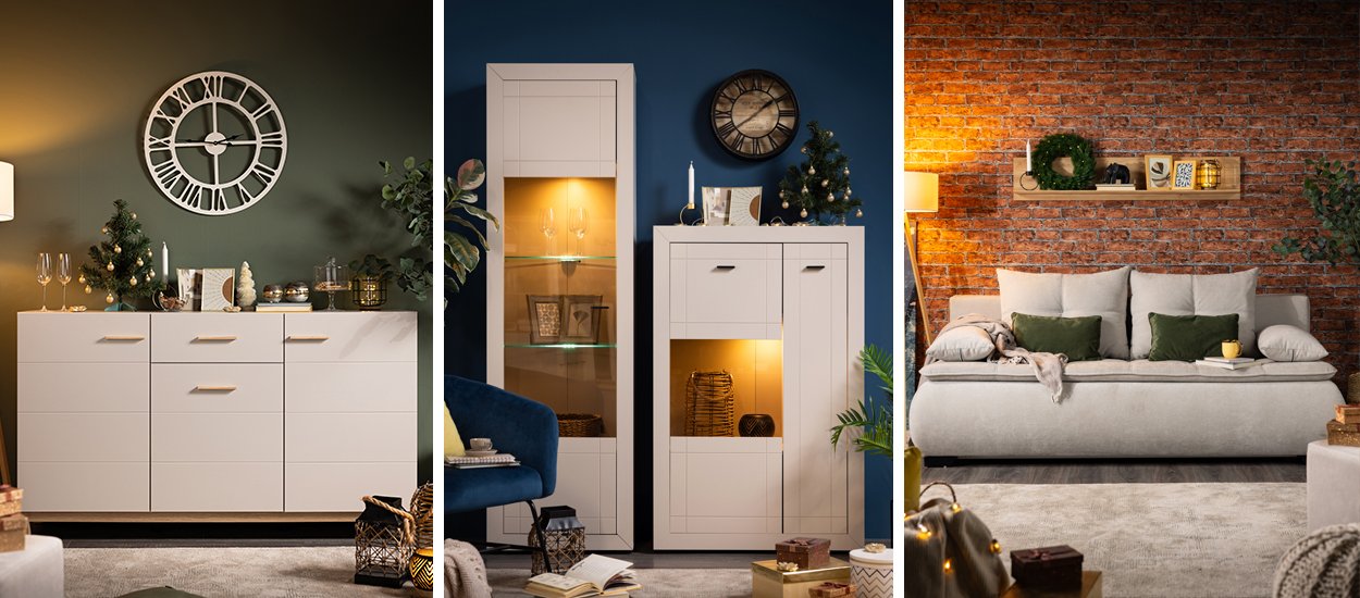 Dolaskom praznične sezone, enterijer se lako može dodatno obogatiti pažljivo odabranim dekorativnim detaljima. Komode i vitrine postaju savršena pozornica za novogodišnje ukrase poput minijaturnih jelki, svetlucavih ornamenata i staklenih figurica, dok se preko tapaciranog nameštaja mogu prebaciti mekani prekrivač ili dekorativni jastuci u toplim crvenim, zlatnim i zelenim tonovima, stvarajući ugođaj praznične topline.