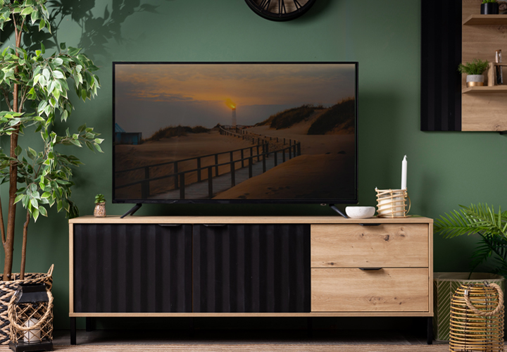 TV polica sadrži dva zatvorena segmenta, dve praktične fioke sa ručicama u drvo dekoru, kao i otvoreni deo sa staklenom policom, idealnim za odlaganjem omiljenih knjiga ili dekoracije, poput dekorativnih slova. Postoji i mogućnost dodavanja rasvete u predelu staklene police.
