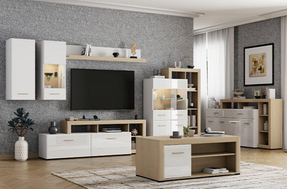 Sistem elemenata CARLOW za opremanje dnevnog boravka predstavlja savremeno i praktično rešenje za atraktivno stilizovanje ambijenta doma. Kombinacija opak belog dekora, svetlog lučkog hrasta i svetle lučke hrast folije unosi u prostor dozu funkcionalnosti, topline i izražene estetske privlačnosti.