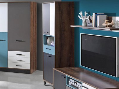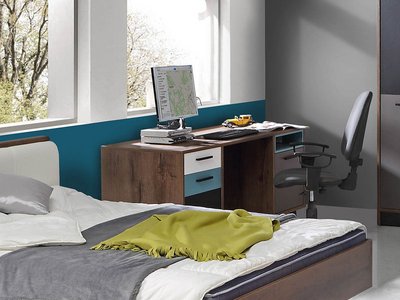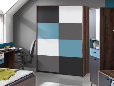 Dečija soba RAVEN za opremanje ambijenta sobe za decu i mlade, idealno je rešenje za sve one koji žele da podare najmlađim članovima porodice nameštaj savremenog dizajna koji karakteriše idealna doza atraktivnosti. Kombinacija drvo dekora, koju čine korpusi u tamnom drvo dekoru, kao i frontovi u kombinaciji belog, zelenog, sivog i crnog dekora, unosi dinamiku u ambijent, ali i stilsku upečatljivost kojoj doprinose visoki nogari koji odlikuju sve elemente sistema. Veliki broj elemenata u sistemu omogućava kompletna rešenja za opremanje ambijenta dečije sobe, dok ujedno pruža značajan praktični upotrebni prostor.